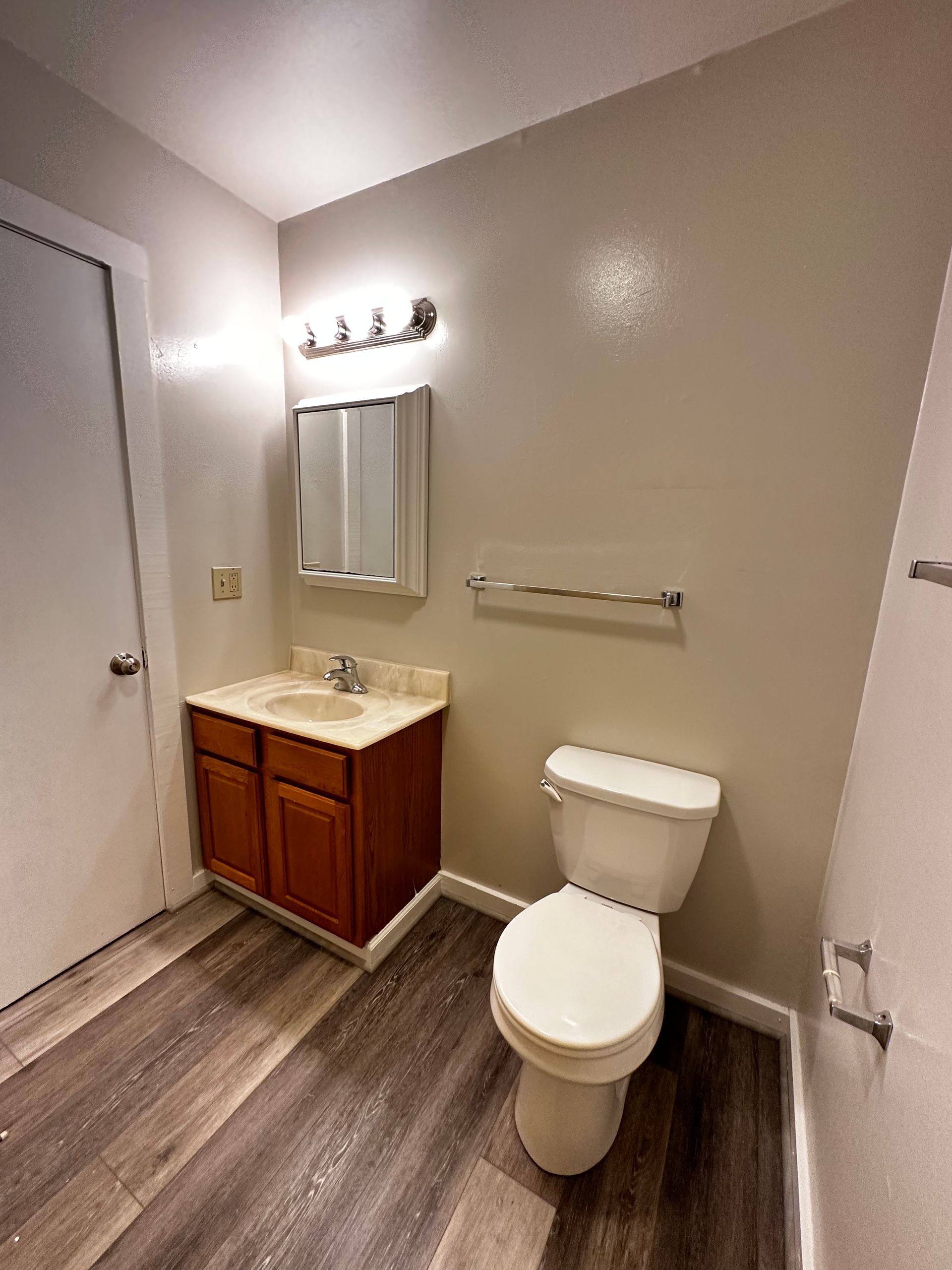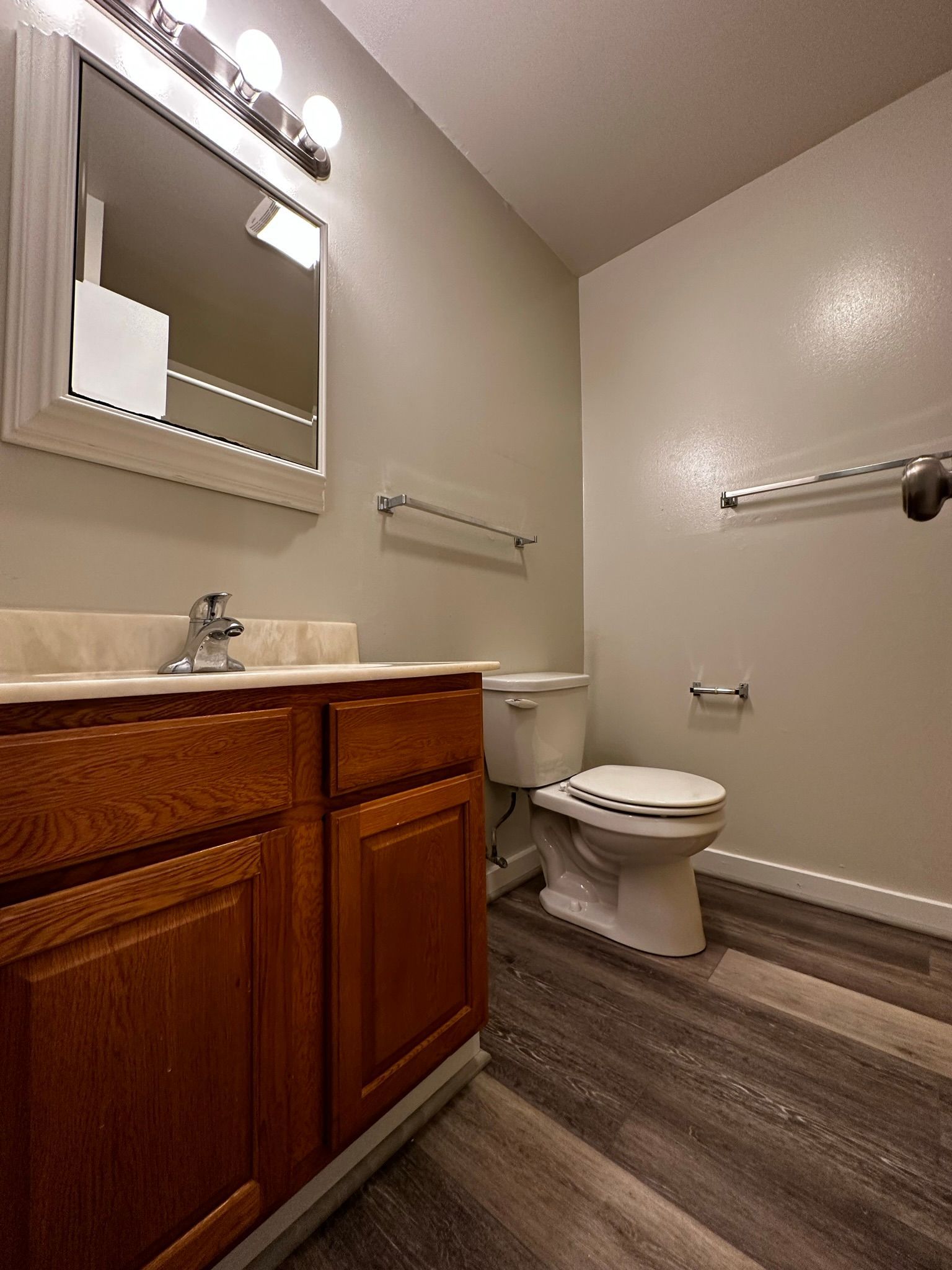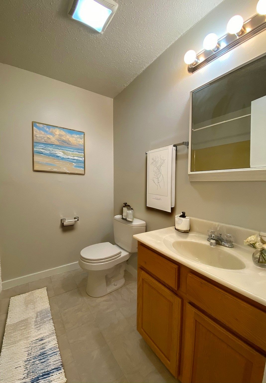- New oak vanity, marble sink, and oversized mirror in baths